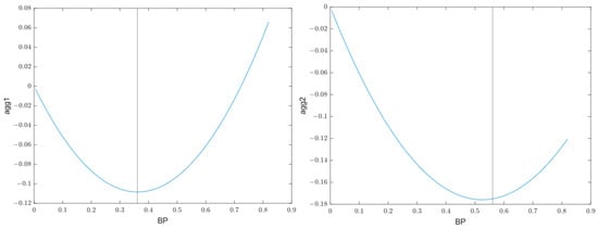 However, such evidence in Table 3 is not sufficient for the existence of a U shape, as the quadratic term may be statistically significant within a monotone interval. Following previous studies [53], we first find out the extreme point of the U-shape curve and then estimate the slopes of the left and right sides of the extreme points. The results are shown in Table 4. When the dependent variable is scale agglomeration (agg1), the interval of the U-curve is [0.0058, 0.8206], and the extreme point is 0.324. The slopes are −0.5898 in the interval [0.0058, 0.324] and 0.7758 in the interval [0.324, 0.8206], both significant at the 1% confidence level. When the dependent variable is specialized agglomeration (agg2), the interval of the U-shaped curve is [0.0058, 0.8206], and the extreme value point is 0.518. The slopes are −0.664 in the interval [0.0058, 0.518] and 0.375 in the interval [0.518, 0.8206], both significant at the 1% confidence level. This test indicates that the U-shaped relationship between the Internet and agglomeration does exist. Figure 2 visualizes such a U-shape.