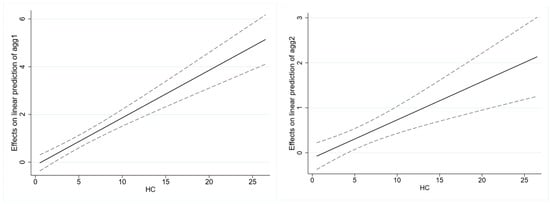 Following related studies [49,50], we focus on the estimated coefficient () of the interaction term () in this model. If this coefficient is significant, it indicates that human capital moderates the non-linear relationship between the Internet and manufacturing agglomeration.