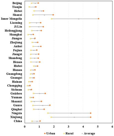 Figure 2 presents the household carbon footprint distribution by urban and rural regions. On average, the per capita carbon footprint of urban households ranges from 0.30 to 5.05 tCO2e, and that of rural households ranges from 0.11 to 1.83 tCO2e. The carbon footprint of household consumption shows a decreasing trend from north to south. The northwest and north are the specific regions with high carbon emissions, both in urban and rural areas. By comparison, the household carbon footprint in the southwest is generally low.