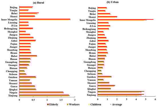 The household carbon footprint by age group in 30 provinces and cities is shown in Figure 3. Regarding the average carbon footprint, the working group has the most carbon emissions, while the elderly group has the lowest emissions. As the primary source of labor market, the working group acquires a large amount of labor remuneration. They are more likely to accept new consumption concepts than the elderly, and are willing to release consumption potential, resulting in a higher carbon footprint. The carbon footprint of the children group is very similar to that of the working group. In urban areas, the per capita carbon footprint of the children group is equal to that of the working group, with 1.06 tCO2e. In rural regions, the carbon footprint of the working cohort is 0.49 tCO2e, which is 0.01 tCO2e higher than that of the children group. Children depend on their parents, the working population, for access to life resources and thus have a similar structure of consumption expenditure. Due to the decreasing occupational competitiveness, older people have less income than younger people and hence have a lower carbon footprint [].