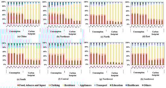 There are differences between the structure of consumption expenditure and their carbon footprint, as the carbon intensity of products differs. The carbon footprint share for housing expenditure is significantly higher than the consumption share. The reason is that the products related to housing are associated with many carbon-intensive industries, such as the metal processing and electricity power industry. This phenomenon is particularly evident in the north and northwest due to the differential energy use efficiencies and household lifestyles. Moreover, although food is the dominant product consumed by households, its carbon footprint is much lower than that of housing.