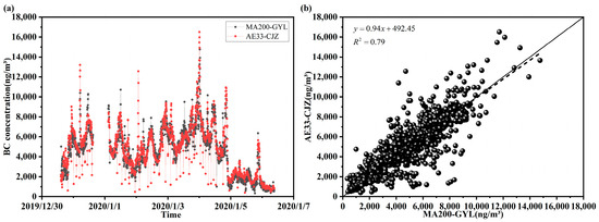 Intercomparison for black carbon (BC) concentration measured by the AE33 at LZU_superstation and MA200 at the top of the Guanyun Building. (a) Time series observation and (b) scatter plots of BC concentration measured by the two instruments.