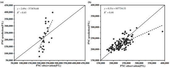 The scatter plots of the predictions and observations of the PNC (a) from hold-out validation (HV) and (b) leave-one-out cross-validation (LOOCV).