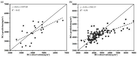 The scatter plots of the predictions and observations of the BC (a) from hold-out validation (HV) and (b) leave-one-out cross-validation (LOOCV).
