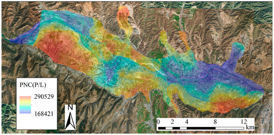 As shown in Figure 4, the spatial distribution of the predicted PNC was closely associated with the distance from the water bodies. PNC generally appears at low concentrations along the Yellow River Valley and its adjacent areas. The microclimate formed in the area of the water bodies contributed to the improved air quality and the deposition of particulate matter. In addition, PNC is related to industrial pollution in our LUR model; the largest petrochemical enterprise is in the Xigu District. The Chengguan District, a developed area in the Lanzhou City Centre, has a high population density and a well-developed road network. Thus, traffic emissions are the main source of urban PNC.