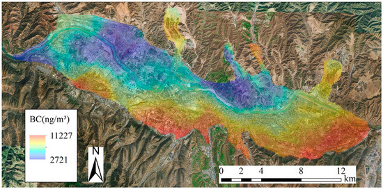 Figure 5 shows the spatial distribution of the predicted BC concentrations in Lanzhou. In general, the BC concentration gradually decreased from south to north. High BC concentrations were mainly in the southeastern Xigu, southern Qilihe, and Chengguan Districts. Among the four districts, the Anning District had the lowest BC concentration. Most of the low BC concentration in Anning District was due to the large coverage area of grassland, which had a significant improvement effect. However, there are many freight distribution centres in the Chengguan District, and it is frequently used by large trucks. In the south of Qilihe District, large coal-fired power plants may have a significant impact.