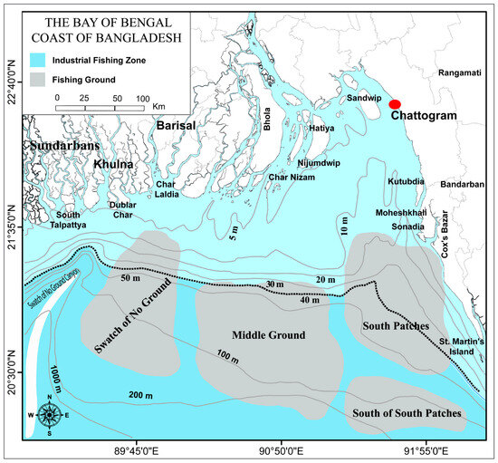 Map of the Bay of Bengal Bangladesh marine waters showing industrial fishing zone (beyond 40 m depth colored by deep sky) and the location of sample unloading (red circle) [7,36].
