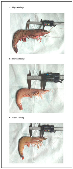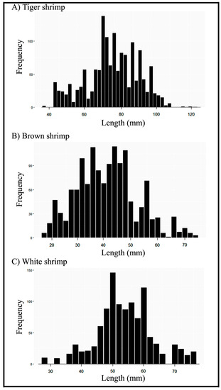 The median length of the tiger shrimp was 79.0 mm, the brown shrimp was 46.0 mm, and the white shrimp was 51.5 mm (Table 1).