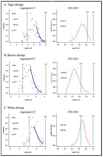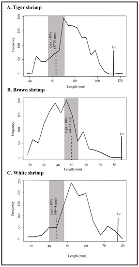 Length frequency distributions of the tiger shrimp (A), brown shrimp (B), and white shrimp (C) show the L∞, Lopt, and (0.9 Lopt − 1.1Lopt) for the grey area.