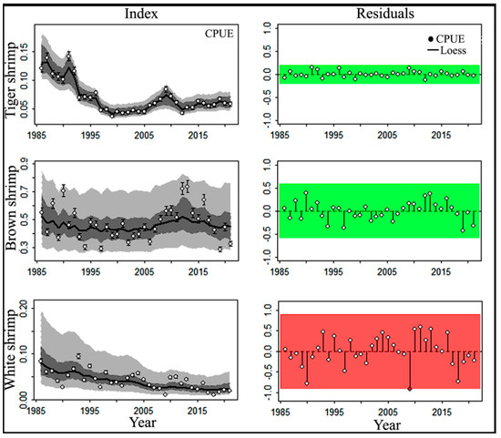 Observed and expected index fit to the CPUE (left) and residuals (right) used for tuning the JABBA model for three major shrimp species. The solid lines in the figures are the model’s predicted values, and the circles are observed data values. Shading areas represent the estimated 95% confidence intervals around the predicted values.