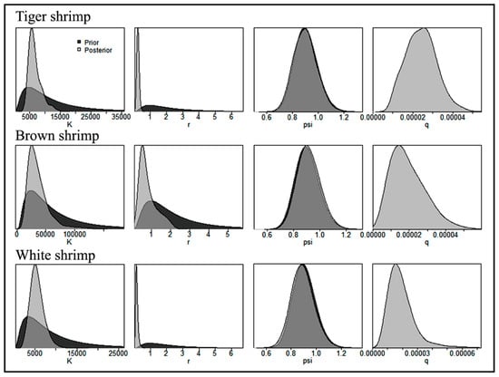 JABBA investigates stock status using catch and abundance indices (CPUE) and the priors of initial carrying capacity (K), intrinsic rate of population increase (r), and starting biomass depletion rate (psi). The initial model run assumed that K was ten times the maximal catch in the time-series data, with a coefficient of variation (CV) of 200% [52]. For r, the general range based on SealifeBase’s resilience categories [27] was used. Commercial-scale shrimp collecting in Bangladesh’s coastal waters began in the 1980s [9]. Therefore, assuming that the stock’s initial biomass was near its carrying capacity (K) with a CV = 0.25, the lognormal biomass depletion prior (psi) for the base model was set at 0.9 K. While the process variance and observation variance priors were implemented by assuming the inverse gamma distributions specified by Winker et al. (2018), all catchability parameters were expressed as non-informative homogeneous priors [39].