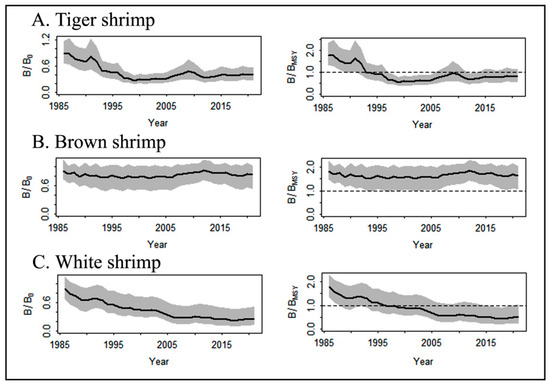 - The relative biomass level (B/BMSY) of the tiger shrimp was 0.43, suggesting an overfishing status, and the values of the brown and white shrimps were 0.84 and 0.96, respectively, indicating that they were fully exploited but not overfished. The estimates of Lc/Lc_opt were less than the unity for tiger and brown shrimps, suggesting that the stocks were suffering from growth overfishing;