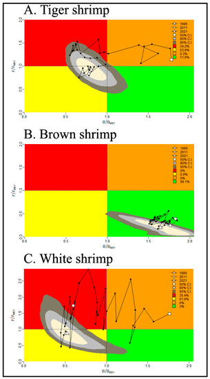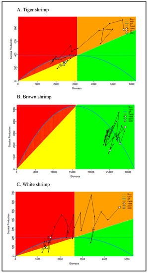 - The estimated maximum sustainable yield (MSY) reference points were optimal: biomass BMSY = 3116 mt, 15,885 mt, and 2649 mt for tiger, brown and white shrimp, respectively, and optimal harvest rate uMSY = 12%, 33%, and 8% for tiger, brown and white shrimp, respectively. The average annual catch for the last ten years was below the estimated MSY values of 389 mt, 4899 mt, and 209 mt for tiger, brown, and white shrimp, respectively;