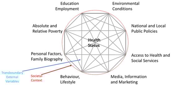 Health is a dynamic condition for humans resulting from multiple inter-relations between all the biological, cultural, chemical, economic, environmental, geographical, physical, political, and social constituents of their habitat, that form a compound web shown in Figure 1. Health is place-based, and should be considered as locality specific, not just population-specific. Empirical research confirms large differences between the health of residents in different cities in the same country (e.g., Edinburgh and Glasgow), as well as between residents living in different neighbourhoods in the same large city [7]. These known health inequalities do not respect ethical principles including “no one will be left behind” in the United Nations 2030 Agenda for Sustainable Development [8].