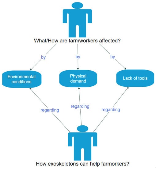 The first hypothesis statement with pre-established factors, which was analyzed in the interview scripts, is shown in Figure 2. Based on the literature presented previously, farmworkers were affected by environmental conditions, physical demand and the lack of tools and had perceptions towards the benefits and barriers of using exoskeletons. This analysis addressed two initial objectives: (i). describe how farmworkers are affected by environmental conditions, physical demand, and the lack of tools; and (ii) how exoskeletons can help farmworkers by reducing the impact on their health due to those factors.