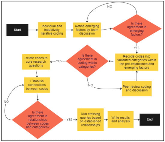 The emerging categories were established by running word frequency queries, finding repetitive patterns, and breaking down the general themes derived from the interview questions. After the individual stage of inductive coding, researchers (RVG, OT, RABC) had a team meeting to share the emerging categories that each one found. During the meeting, researchers made small adjustments regarding the final coding categories, starting from a correspondence between them of 75% in the code, until they reached a consensus. Then, two researchers (RVG, OT) peer-reviewed each quote in detail and coded them together in the newly established categories until a full consensus was reached. After coding consensus, the group (RVG, OT, RABC) established the relationships and connections between categories and codes as the common ground questions for the crossing queries analysis. Then the results and conclusion were discussed in groups.