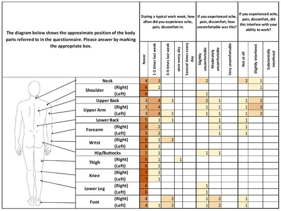The heat map in Figure 4 shows the number as a raw count of participants’ responses to the NMQ concerning the position of the body parts, where the workers marked their discomfort, and the frequency when they experienced the ache, pain, or discomfort. If workers experienced discomfort, the diagram also shows the marks for the discomfort presented and how much the discomfort interfered with their ability to work for each body part.