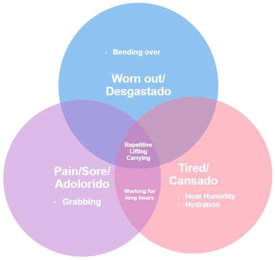 During the qualitative analysis, special descriptive adjectives and sensations for certain activities were found. Figure 6 represents a Venn diagram that crosses the physical postures involved in the sensations of being worn out, tired and sored. It shows the postures applied to describe specific sensations and the postures shared in the sets of sensations. It also shows that repetitive lifting and carrying left the sensation of being worn out, tired and sore. However, grabbing only generated pain, bending over only generated wear, and the heat, humidity, and hydration generated a feeling of tiredness. Working for long hours generated both pain and tiredness. There was no direct or significant relationship between sensations and JT. Workers did not describe their sensations in relation to their JT but rather with their PA. The PA used for describing the JT was not mutually exclusive among the JT.