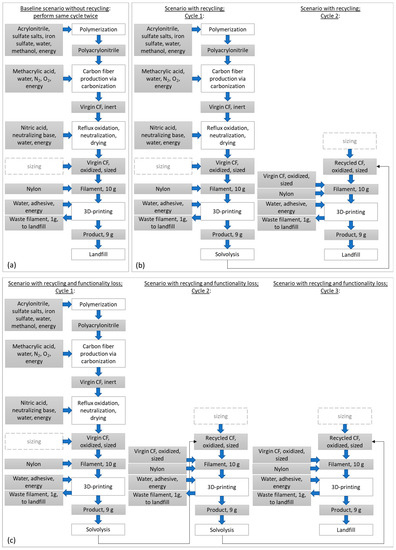 Manufacture of virgin CF: Polyacrylonitrile (PAN)-based CFs were selected in this research, considering that PAN is the predominant precursor for CFs [19]. PAN synthesis via polymerization of acrylonitrile was modelled based on the laboratory-scale protocol reported by El-Newehy and co-workers [20]. The production of CFs from PAN was modelled based on previously published protocols [19,21], assuming a yield of 1 kg CFs per 5.64 kg polymer [21] and a ratio of 90% PAN and 10% methacrylic acid as the added co-monomer [19]. After the synthesis of inert CFs, reflux oxidation for 1.5 h in concentrated nitric acid was modelled, followed by neutralization of the acidic solution, washing the fibers with demineralized water until neutral effluent pH, vacuum filtering to recover the fibers, and overnight drying in a laboratory oven, as has been previously reported [22]. The sizing of the oxidized CFs was excluded because a sufficiently detailed protocol to model this process was not available. The electricity consumption for the equipment used in the aforementioned procedures was calculated based on data retrieved from laboratory equipment providers (i.e., Cole-Parmer Instrument Co. Europe; Bioevopeak Co., Ltd., China; Beckman Coulter Inc., Brea, CA, USA; VACUUBRAND GmbH + Co. KG, Germany), assuming the optimal utilization of the equipment (i.e., based on the production volume compared to the total capacity of the devices). In order to model the manufacture of CFs independently of the country of origin, global (GLO), Rest-of-World (ROW) and Rest-of-Europe (RER) electricity (medium voltage), processes (e.g., wastewater treatment), and input materials were selected from the Ecoinvent database. Considering that the country of origin was unknown, transportation was excluded from our analysis.