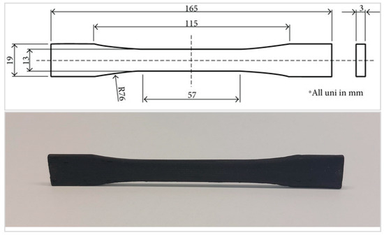Above: schematic of 3D printed coupon ASTM D638 Type I. Below: photograph of the printed coupon described in this manuscript.