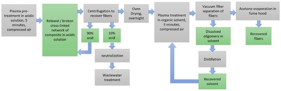 End-of-Life processes (i.e., landfilling and recycling): For the baseline scenario (i.e., without recycling) and the final treatment process (i.e., landfilling) applied after 10 years in all scenarios, the same landfill process from Ecoinvent was considered, as described in the previous paragraph for the waste filament material from the 3D printing process. While both solvolysis processes modelled have the potential to recover both the CFs and the polymer from the treated coupon, only the recovery of CFs was modelled here, whereas the monomers/oligomers from the polymer were modelled as waste products, undergoing wastewater treatment while dissolved in the solvent. Supercritical water solvolysis of the product was modelled based on the laboratory-scale protocol reported by Chaabani and co-workers [5], scaled up for the treatment of 100 g of reinforced polymer in one batch at 400 °C and 25 MPa pressure for 15 min under continuous ventilation, using a high-pressure tube furnace (modelled based on compatible equipment from the laboratory equipment provider MTI Corporation, KJ Group). After the solvolysis step, the polymer dissolved in water was separated from the recovered fibers via vacuum filtering and disposed of via a wastewater treatment process. The recovered fibers were further purified with a 10 min ultrasonication step and oven-dried overnight. A schematic of this process is shown in Figure 4. The plasma-enhanced solvolysis of the 3D printed product was modelled based on unpublished information provided by the practitioners as a batch treatment process for 100 g of reinforced polymer. Briefly, the process consisted of two 5 min treatment steps, using compressed air as input at ambient conditions, with the first step performed in a plasma-enhanced acidic solution (modelled as 34% nitric acid), and the second step in a plasma-enhanced organic solvent (modelled as acetone). The electricity consumption of the plasma generator was modelled based on the measurements reported by Aileni and co-workers [23]. The polymer-covered fibers recovered after the first step were separated from the bulk acidic solution via centrifugation and oven-dried. A total of 90% of the acidic solution was reused, and 10% was disposed of in a wastewater treatment process after neutralization. The fibers underwent a second treatment step, wherein they were completely separated from the polymer, purified via vacuum filtering, and dried under ventilation. The organic solvent was recovered via distillation, and energy consumption was calculated based on the specific heat capacity and boiling point of acetone. As was also the case for the manufacturing process of virgin CFs, additional equipment energy consumption data were acquired from equipment suppliers and modelled considering the optimal use of equipment in terms of capacity. Given that the recycling activities take place within Europe, the European average (i.e., Europe without Switzerland or RER) of medium voltage electricity and processes (e.g., for wastewater treatment) were selected, when possible, from the Ecoinvent database for the two solvolysis processes. A schematic of this process is shown in Figure 5.
