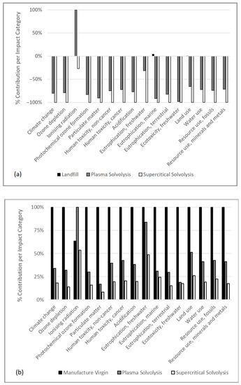 As EoL processes (Figure 6a), both solvolysis treatments result in negative environmental impacts across most impact categories, given that the recovered product (i.e., CFs) can be credited as an avoided product (i.e., avoided production of virgin CFs). Specifically, considering the climate change potential (expressed as kg of CO2 equivalents) and based on the investigated lab-scale processes, landfilling of 1 kg of composite material resulted in emissions of 0.11 kg of CO2 eq., whereas recovering CFs from 1 kg of composite material resulted in avoided emissions of −37.4 kg and −46.5 kg of CO2 eq. for the plasma-enhanced and supercritical water solvolysis, respectively. In Figure 6b, the cradle-to-gate manufacture of virgin CFs (i.e., excluding EoL) is compared to the gate-to-gate recovery of CFs via solvolysis. A gate-to-gate system boundary was selected for solvolysis, given that the input material was a waste product, and thus no impact was credited from its manufacture to its EoL treatment, while also no benefit (i.e., avoided virgin CF production) was credited to it [14]. As can be observed, a significant decrease in environmental impacts in most impact categories was calculated for the two solvolysis processes, compared to the manufacture of virgin CFs (resulting in 420 kg CO2 eq. emissions per kg of virgin CF manufacture), with up to 82% and 66% decrease in climate change potential for supercritical water solvolysis (corresponding to 75.7 kg CO2 eq. per kg of recovered CFs) and plasma-enhanced solvolysis (corresponding to 143 kg CO2 eq. per kg of recovered CFs), respectively, assuming that the recovered CFs undergo no functionality loss during solvolysis. Interestingly, even with an assumed 50% loss of functionality, the two solvolysis processes tested had a lower impact across most impact categories considered compared to the cradle-to-gate impact of virgin CF manufacture, with up to 64% lower climate change potential for CFs recovered via supercritical water solvolysis and a 50% loss of functionality (corresponding to 151 kg CO2 eq. per kg of recovered CFs, not shown in Figure 6b).