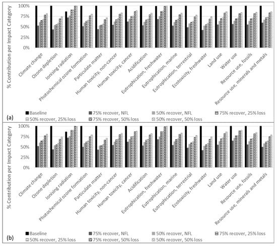 The entire lifecycle of products manufactured with nylon PA6 or PA12, based on different scenarios for the EoL treatment (i.e., landfilling and supercritical water solvolysis), percentage of recovered CFs in the product (0%, 50%, and 75%), and percentage of functionality loss of recovered CFs after solvolysis (0%, 25%, and 50%) were analyzed, and the findings are shown in Figure 7a (for PA6) and Figure 7b (for PA12).