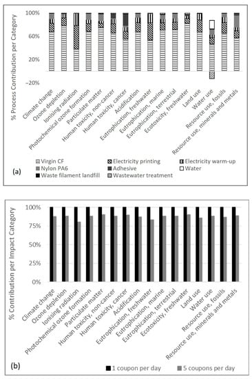 The product lifecycles presented in Section 3.2 were modelled assuming that one product (i.e., coupon) is printed at a time, and therefore all impacts of printing are fully credited to the product being printed. However, the environmental impact can be improved by printing multiple products in a row, thus decreasing the electricity consumption allocated to each product during the warm-up phase of the equipment and resulting in lower filament loss per product (e.g., one skirt needs to be printed for several products). In Figure 8a, the contribution of each input and output during 3D printing is shown for each impact category, assuming that one coupon is printed at a time. Instead, Figure 8b shows a comparative impact assessment of the 3D printing process, assuming either that only one product is printed at a time or that five products are printed in a row. Both assessments use virgin CFs (15% wt.) and nylon PA6 as the filament input. As can be observed in Figure 8b, using the 3D printer at a higher capacity results in lower environmental impacts per product across all impact categories, with, for example, up to a 12% decrease in climate change potential, from 0.93 kg CO2 eq. to 0.82 kg CO2 eq. per one coupon of 9 g. More specifically, when considering only the filament waste generation for printing one coupon or five coupons in a row (as described in Table 1), an 8% decrease in all impact categories is calculated. When considering only the energy consumption optimization (as described in Table 1), the environmental impact decreases by over 27% across all impact categories. A similar finding was reported in previous LCA studies on AM using 3D printing, wherein maximizing the use of equipment (24 h per day, 7 days per week) resulted in nearly ten times lower environmental impacts compared to low utilization (one printing job per week, with machines being powered down or set to idle mode when not printing) [10]. The most notable improvement for the overall process corresponds to the ionizing radiation (Figure 8b), which decreases by 20% when equipment is used at a higher capacity. Such an improvement is particularly significant, considering that the ionizing radiation associated with the 3D printing process results in substantially higher impacts when the functionality of CFs decreases during the solvolysis process, as discussed in Section 3.2. These results indicate that the environmental footprint of composite materials using recycled CFs can be further optimized by optimizing the use of equipment during their lifecycle.