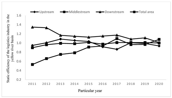From Figure 1, we can see that the efficiency of the logistics industry in the Yellow River Basin generally shows a flat upward trend during the study period. However, the development differs between the upper, middle, and lower reaches of the region. The downstream is the best developed, with an average efficiency value of 1.165; the upstream is the second, with an average efficiency value of 0.984; and the midstream is the worst, with an average efficiency value of 0.868. During the study period, the trend in the downstream ranged from high to low, the trend in the midstream ranged from low to high, the trend in the upstream moved up and down below 1, and eventually all three trend lines converged to 1. This is because the logistics industry is a highly mobile industry, and the close communication and interaction between regions is conducive to learning from each other, which improved the development imbalance and gradually converged the efficiency values.