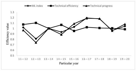 The Malmquist–Luenberger (ML) index model was applied to dynamically measure the efficiency of the logistics industry in the Yellow River Basin, and the ML index and decomposition term mean values of the efficiency of the logistics industry in the whole Yellow River Basin upper, middle, and lower reaches, as well as nine provinces, from 2011 to 2020 were obtained, and the specific values and change trends are shown in Table 5 and Figure 2.