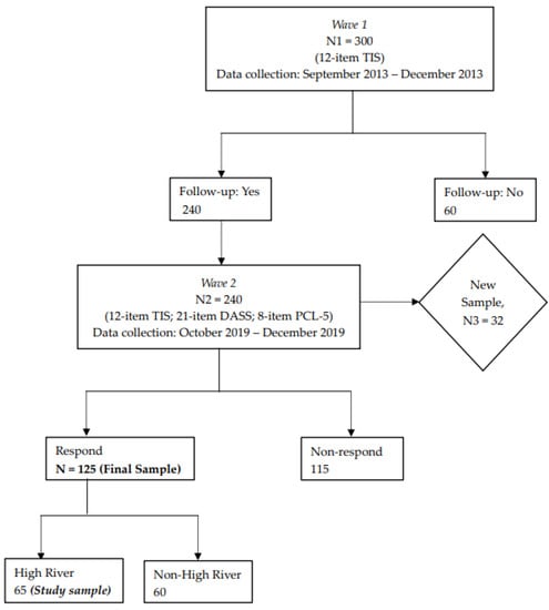 Initially, 300 respondents from Southern Alberta, Canada completed a web-based survey, which investigated the immediate transitional impact of the 2013 Southern Alberta flood. Wave 1 took place from 15 September 2013 to 31 December 2013, starting some 3 months after the flood had occurred. These people were the general adult population, all residing in the Southern Alberta region, and whose day-to-day language was English. Wave 2 was initiated 72 months later with the same population. Data were collected between 10 October 2019 to 15 December 2019. Participants (240 out of 300) who specifically stated during Wave 1 that they would be interested in taking part in the follow-up and provided their email addresses were sent an online survey form. The second wave of data collection took place with the respondents who participated in the first wave. In total, 125 participants out of 240 returned the completed survey form, and the remaining 115 did not fill out the questionnaire. The reasons we anticipated were that the study participation was strictly voluntary, the time gap between the two waves was quite long (i.e., six years), and some of the email addresses provided by the respondents during the first wave might not be in use anymore. Additionally, a new group of 32 people affected by the 2013 Southern Alberta flood were recruited for replication purposes. Note that this new group of people did not participate in the first survey immediately after the flood. The advertisement of study recruitment was disseminated over websites and social media which included an URL link to the online questionnaire. Participants could fill out the survey form at their own pace. All participants who took part in the follow-up study were remunerated if they completed the questionnaire and indicated that they would like to receive the money. Among the 125 longitudinal participants, 65 indicated that they were living in the High River area, the town that was worst hit by the flood [10,64,65]. The rest of the samples were from other locations in Southern Alberta, e.g., Calgary, Canmore, Lethbridge, and Cochrane (Figure 1). Our current study sample focused on the 65 High River-area respondents who participated in Wave 1 and Wave 2. We restricted the analysis to these 65 respondents because, during the flood, this community was at the epicenter [13,64,66,67]. The 2013 flood also had a different time course and impact level on different areas of Southern Alberta, and we were interested in investigating the effect the flood of 2013 had on this High River community over time. Demographic characteristics of the Wave 1 and Wave 2 samples are reported in Table 1.