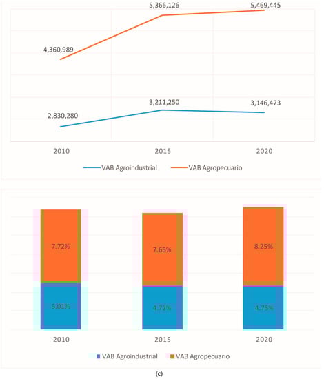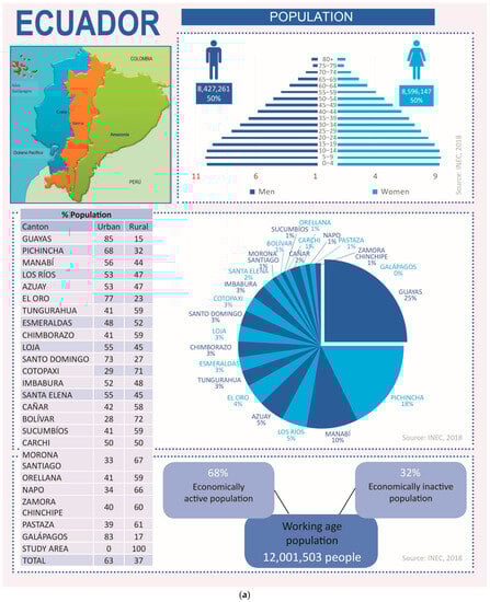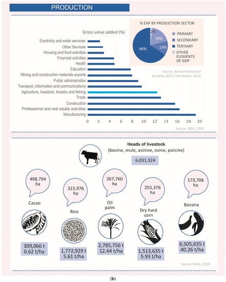 Currently, Ecuador has 17,023,408 inhabitants. According to the three-sector model of economic activities, the primary sector involves the extraction of raw materials, in which 19% of Ecuador’s economically active population (EAP) is employed; the secondary sector is dedicated to manufacturing and employs 13% of the EAP; and the tertiary sector, employing 66% of the EAP, is made up of service industries that facilitate the transport, distribution and sale of goods produced by the secondary sector. The primary sector, which includes agriculture, livestock production, forestry and fishing, is among the principal activities in most provinces, has a stimulating effect on Ecuador’s overall economy (Figure 1a–c) and accounts for 12% of the gross value added (GVA). The GVA is the difference between production and intermediate consumption and contributes directly to the country’s gross domestic product (GDP) [48].
