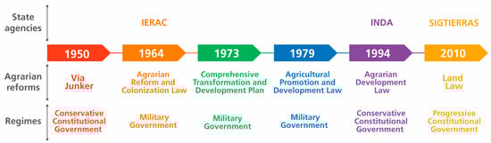 In many countries, the state creates policies to support agricultural producers and contribute to food security [10]. Some came into being through agrarian reforms [11,12,13], and others through development programmes [14,15]. Agrarian reforms commonly involve changes in land tenure and related policies and tend to alter relations between agricultural production and distribution [16]. For instance, in the 1960s and 1970s, inequality in tenure included exploitative labour conditions. According to Vergara and Kay [17], agrarian policies in Latin America during those decades were influenced by programmes of social protectionism intended to involve small producers in commodity chains, a situation that does not favour peasants. They also indicate that conservative governments championed capitalism, whereas progressive regimes lacked clear development agendas or strategies. Insights into the results of past agricultural policies have been identified in several countries; however, few offer an analysis of the sustainability of these practices.