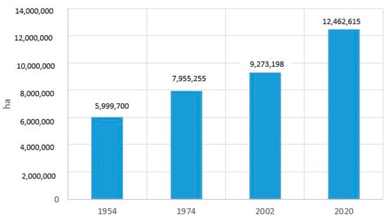 Based on data from the National Agricultural Censuses, policies to increase the agricultural frontier were, in fact, successful: in 1954, cultivated areas covered 5,999,700 ha; in 1974, they covered 7,955,255 ha; and in 2000, the covered 12,355,831 ha. [73,74].