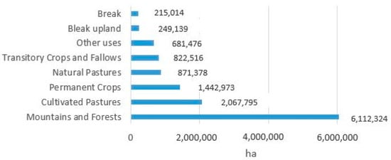 We were unable to compare information regarding land use between 2002 and 2013 and 2014 to the present due to changes in the methodology regarding measurement/description. The main land use data available are for pasture for milk and meat production, permanent and temporary crop lands and forested lands [102] (Figure 7).