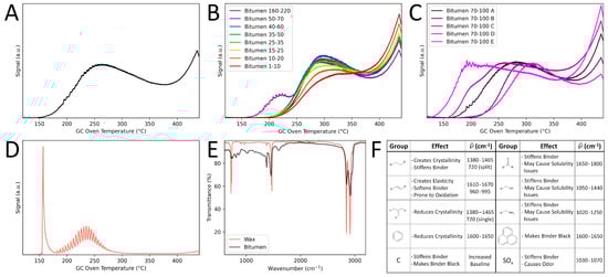 Figure 1. Classifying a bitumen based on its molecular weight and composition. (A) Typical GC-chromatograph of a bitumen, showing its wide molecular distribution with various boiling points. (B) The average molecular weight of a bitumen determines its pen grade. (C) Bitumen of the same pen grade, but different supplier, can vary widely in molecular weight distribution but has comparable average molecular weight. (D) GC-chromatograph of a wax, which has a significantly lower boiling point compared to the bitumen shown in (A). (E) IR of the wax of (D) and bitumen of (A). The twin peaks at 720 cm−1 and 1470 cm−1 show that the wax is predominantly made of non-branched aliphatic hydrocarbons, whereas bitumen comprised a mix of hydrocarbons indicated by the various visible peaks. (F) A collection of common groups found in bitumen, along with their effect on the stiffness of the binder and the wavenumber at which they can be detected with IR.
