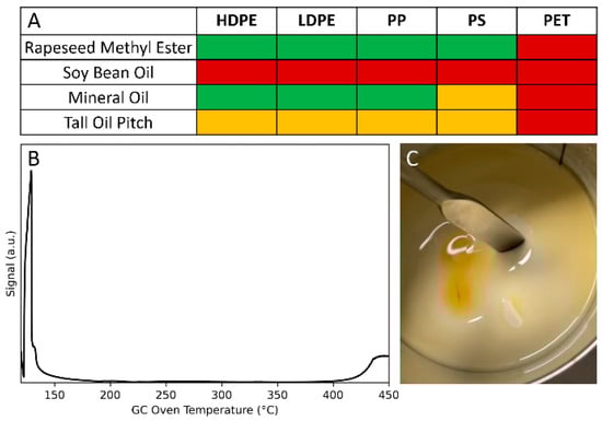 Figure 2. Effect of the choice of oil on the binder. (A) Overview of solubility of plastics in various oils. Green indicates full solubility, orange indicates solubility but with inhomogeneous stiffness and red indicates insolubility. (B) GC chromatogram showing that there is a gap in molecular distribution between the used oil (rapeseed methyl ester, RME) and plastic (polystyrene, PS) of this binder. (C) As soon as the binder of RME and PS is agitated, the oil behaves as a liquid whereas the plastic behaves as a solid, causing phase separation due to the large discrepancy in molecular weight between the two components.