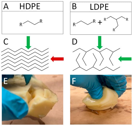 Figure 3. Effect of the choice of plastic on the binder. (A) HDPE comprised linear aliphatic hydrocarbons. (B) LDPE is also comprised of aliphatic hydrocarbons, but has side branches in its chains. (C) HDPE stacks its linear chains. Force applied parallel to these chains (indicated with a red arrow) easily breaks them up. (D) The side branches of LDPE prevent them stacking, so that they can resist forces from all sides (indicated by the green arrows). (E) Simply placing a finger on a binder with only HDPE as the high molecular weight component will cause it to crack. (F) Introducing LDPE to the binder will create a flexible binder, even if it contains some HDPE.