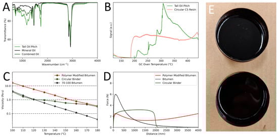 Figure 4. Circular binder based on tall oil pitch and LDPE. (A) IR spectrum of mineral oil (black) and tall oil pitch (light green). By combining both oils (dark green), the polar groups of the oil phase indicated by the peaks between 1050–1440 cm−1 and 1650–1800 cm−1 can be reduced to make the apolar LDPE better soluble. (B) GC of tall oil pitch and the circular C5 resin. The broad molecular weight distribution of both components indicated by their wide boiling point creates a binder that does not show phase separation upon agitation. (C) Viscosity of bitumen (black), polymer-modified bitumen (red) and the circular binder (dark green). At temperatures below 120 °C the circular binder has similar viscosity to normal bitumen, whereas its viscosity slowly becomes more like a polymer-modified bitumen as the temperature increases to 170 °C. (D) Cohesion at 5 °C of a 70–100 bitumen (black), the circular binder (dark green) and a polymer-modified bitumen (red). (E) Visual example of the circular binder (top) and bitumen (bottom).
