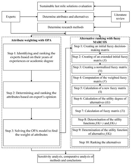 To summarize, this paper used a two-stage MADM model for evaluating sustainable last-mile solutions with a case study in Vietnam. First, the OPA method is applied to calculate the weight of attributes; then the fuzzy MARCOS method is utilized to rank the alternatives. A comparative analysis of the related MADM methods shows the applicability and robustness of the proposed model. The research framework is presented in Figure 1, which consists of two main stages: Attribute weighting with OPA and alternative ranking with fuzzy MARCOS.