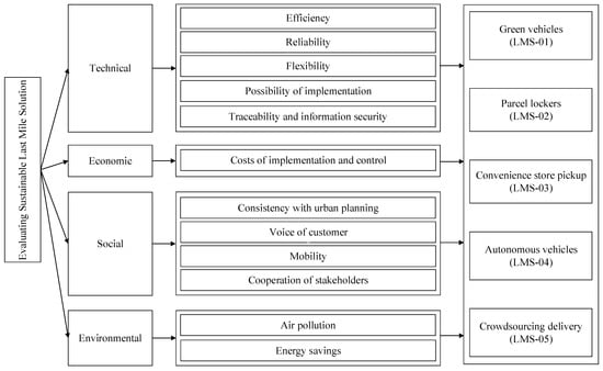 In this paper, some of the most analyzed initiatives, concepts, and technologies for last-mile delivery, which are the elements of the LMSs proposed, are green vehicles, parcel lockers, convenience store pickup, autonomous vehicles, and crowdsourcing. Table 1 shows the distribution of recent studies regarding the initiatives mentioned earlier. To evaluate these solutions, the authors mainly deal with the problems and analysis of the implementation of individual LMS in terms of their ability to achieve economic, social, and environmental sustainability from a developing country’s perspective. In this direction, we try to evaluate previous studies to establish a viable set of criteria alongside the proposed hybrid MADM approach development, as displayed in Table 2.