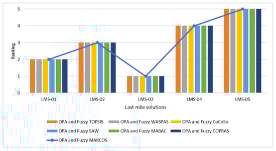 The use of fuzzy MARCOS in the literature is elaborated in the sections above, indicating that it can be effectively used in combination with OPA. However, the integration of OPA and fuzzy MARCOS has not yet been researched. Combining these methods can be a novelty that has not been studied in the state-of-the-art. Thus, there are two salient features that distinguish our research from existing studies. First, our study fills the gap in the MADM literature by combining OPA and fuzzy MARCOS methods for the first time, to the best of our knowledge, and second, investigating its advantages in a case study in the selection of LMSs from a developing country’s perspective of Vietnam. Factors and initiatives in last-mile logistics were determined through the literature and experts’ responses. Five solutions (green vehicles, parcel lockers, convenience store pickup, autonomous vehicles, and crowdsourcing delivery) are evaluated regarding their sustainable implementation under technical, economic, social, and environmental dimensions. Furthermore, a comprehensive sensitivity analysis and comparative analysis are provided, which illustrates the priority of the experts and even the priority of human judgment.
