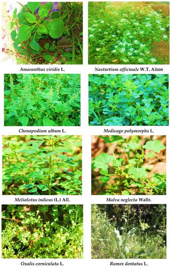 The dry matter content (%) ranged from 9.55 ± 0.2% to 21.60 ± 0.2%. The highest dry matter (%) was found in Oxalis corniculata (21.60 ± 0.2%), followed by Meliolotus indicus (21.56 ± 0.1%) and Medicago polymorpha (20.70 ± 0.3%), respectively. The lowest value of dry matter (%) was found in Nasturtium officinale (9.55 ± 0.2%). The low dry matter content (%) and low crude fats content results in low energy value in plants’ bodies []. The dry matter content (%) of plants depends on the internal tissues of plants. The topography and altitude level may also affect the plants’ dry matter content. The dry matter content of plants increases with altitudes and vice versa []. The results of the present study on dry matter content are parallel and close to the findings of other researchers [,].