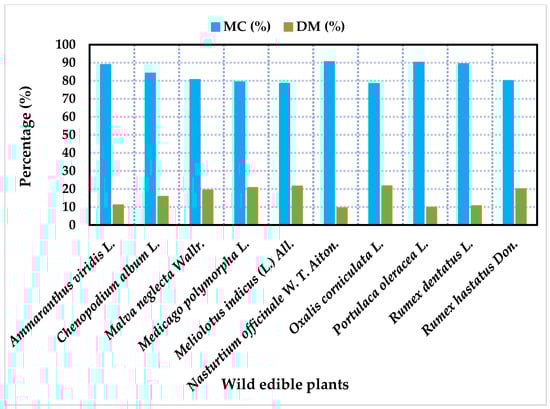 Similarly, the lowest moisture content (%) was found in Oxalis corniculata (78.40 ± 0.4%). The highest moisture content (%) in plants shows the maximum water-holding capacity of plant tissues []. Food containing the maximum amount of water is digested easily as water is essential for metabolic reactions in the body and prevents desiccation of body tissues []. The WEPs examined for moisture (%) showed enough moisture content in their tissues to fulfill human needs. The present study’s moisture (%) results are parallel and in line with previous studies [,,].