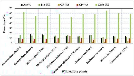 The ash content (%) in the plant body indicates the number of minerals present in the plant body []. The ash content (%) in the selected wild edible plants ranged between 9.95 ± 0.5% and 17.80 ± 0.3% (Figure 4). The maximum ash content (%) was calculated in Chenopodium album (17.80 ± 0.3%), followed by Malva neglecta (17.65 ± 0.02%) and Oxalis corniculata (15.75 ± 0.04%), respectively. The minimum ash content (%) was found in Amaranthus viridis (9.95 ± 0.5%). The ash content (%) calculated in the current study is similar and comparable with the results of previous studies [,], confirming that the investigated WEPs are a good source of essential minerals beneficial to human health. The dietary fibers encourage the development of useful microbes present in the gastrointestinal gut of humans. The crude fibers (%) ranged between 12.40 ± 0.05% and 16.45 ± 0.5%. The highest value of crude fibers (%) was found in Meliolotus indicus (16.45 ± 0.5%), followed by Oxalis corniculata (16.10 ± 0.5%) and Amaranthus viridis (16.05 ± 0.02%), respectively. The lowest crude fiber value (%) was reported in Portulaca oleracea (12.40 ± 0.05%). These findings are analogous and comparable with the results of earlier studies []. Proteins are useful for the growth and development of the body, enzyme production, repair of tissues, hormone production, and overall body functioning []. The crude proteins (%) ranged between 6.90 ± 0.02% and 14.40 ± 0.1%. The maximum proteins (%) were found in Meliolotus indicus (14.40 ± 0.1%), followed by Nasturtium officinale (10.88 ± 0.4%) and Medicago polymorpha (10.35 ± 0.3%), respectively. The minimum crude proteins (%) were found in Oxalis corniculata (6.90 ± 0.02%).