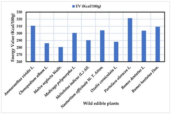 The energy value (E.V.) of wild edible plants (WEPs) ranged between 280.70 ± 0.5 and 321.38 ± 0.4 as shown in Figure 5. The maximum energy value was calculated in Portulaca oleracea (321.38 ± 0.4 Kcal/100 g), followed by Amaranthus viridis (310.75 ± 0.6 Kcal/100 g) and Rumex hastatus (309.40 ± 0.3 Kcal/100 g), respectively. The minimum energy value (E.V.) was calculated in Malva neglecta (280.70 ± 0.5 Kcal/100 g). It has been observed and reported that the energy values of plants at lower altitudes are higher than those of plants found at higher altitudes. The results of the energy value of the present research study are in harmony and parallel with previous studies [,].