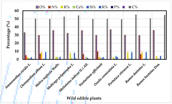 The present EDX elemental analysis of wild edible plants (WEPs) showed that these plants are rich and important sources of essential and vital elements. The value and usefulness of elements for the human body are crucial and imperative. All elements with the atomic number 11 and above were detected in tested plant samples. The results of the existing elemental analysis explored that carbon and oxygen were the most abundant elements in all plant samples in terms of weight (%). The maximum value of carbon (%) existed in Portulaca oleracea (55.28%), followed by Rumex hastatus (54.78%) and Medicago polymorpha (54.30%), respectively. The highest value of oxygen (%) was calculated in Oxalis corniculata (36.60%), followed by Rumex hastatus (35.70%) and Malva neglecta (35.58%), respectively.