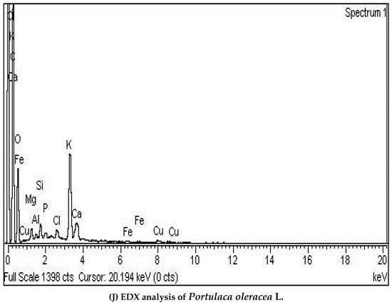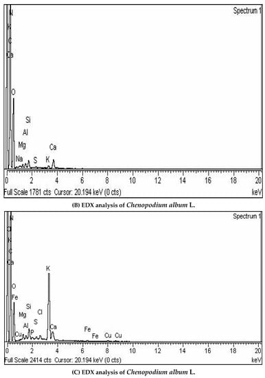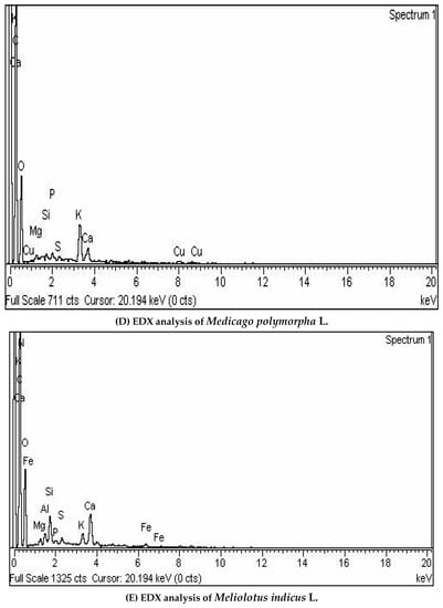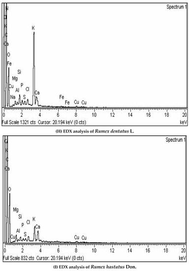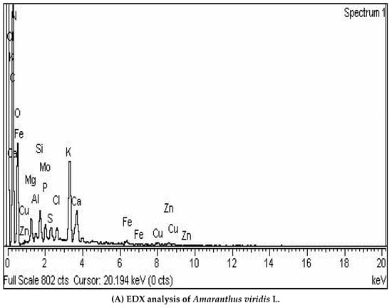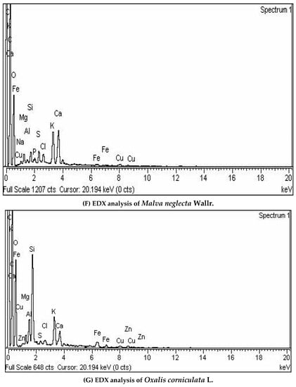 The energy dispersive X-ray analysis (EDX) of powdered plant samples was conducted using EDX (JEOL JSM 7600F; Tokyo, Japan) at the Central Resource Laboratory, University of Peshawar, Pakistan. Two grams of each powdered plant sample were used, kept on a metal pellet (JEE 420) cello-tape, and coated with gold using a vacuum evaporator (JEOL, Tokyo, Japan). The scanning electron microscope (SEM) was attached to EDX (Inca, 200 Model; Oxford Company, Oxford, UK) [].