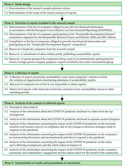 The aim of Phase 1 was to define the criteria for the selection of reports included in the research sample and to determine the scope of the analysis to be carried out in subsequent phases of this study. It was assumed that the research sample would consist of sustainability reports published by companies which are obliged to disclose them in accordance with the Non-Financial Reporting Directive (NFRD) [] or the Sustainable Finance Disclosure Regulation (SFDR) []. It was also decided to include the sustainability reports voluntarily prepared by companies in the research sample to compare whether and what the difference was in disclosing information on the COVID-19 pandemic in the situation of having an obligation to report sustainability issues and not having such an obligation.