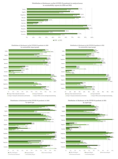 The content of the collected reports was analyzed to identify whether and where in the sustainability report and in relation to which issues the companies disclosed information on the COVID-19 pandemic. The content analysis method was chosen because this is a method for collecting systematic, objective and repeatable information contained in the analyzed set of texts, and then interpreting the information to draw conclusions. An Excel file was used to collect the data describing the disclosure of information about the COVID-19 pandemic in the sustainability reports. To facilitate the interpretation of the obtained information and to perform its quantitative analysis, we decided to codify the data identified in the content analysis into categorical variables using: value 1—when the company disclosed information about the COVID-19 pandemic in a given area of the report; value 0—when the company did not disclose information about the COVID-19 pandemic in a given area of the report; and n/a—when the report for the given year was not obtained. Based on these data, a descriptive analysis was performed to determine the main issues that companies most frequently disclosed about the COVID-19 pandemic. In the next step, a detailed qualitative analysis of specific information on the COVID-19 pandemic disclosed by individual companies included in the research sample was performed within the scope determined in the first phase of this study.